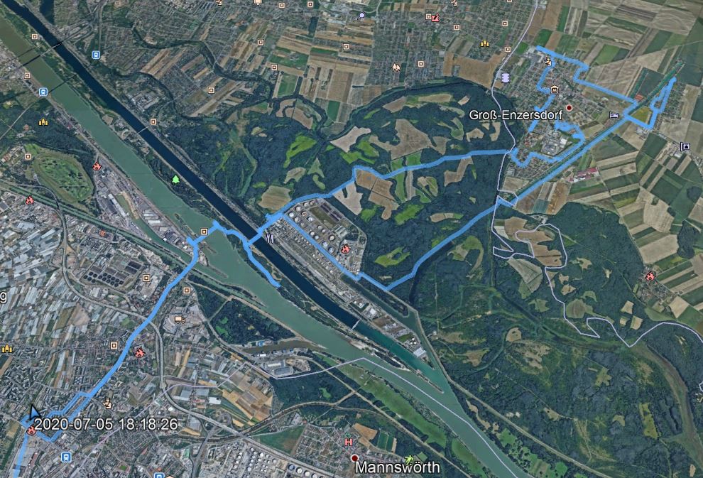 Heute mit dem E-Bike die erste längere Ausfahrt zum Geocaching. Dazu überquere ich die Donau beim Kraftwerk Freudenau und nehme die Walulisobrücke über die Neue Donau. Am Tanklager vorbei über die Vorwerkstrasse durch die Lobau nach Groß Enzersdorf. Um die 30 Grad Celsius lassen die meisten Menschen das kühle Nass oder einen Schatten suchen. Ideal zum Geocaching, denn es sind wenig Muggel unterwegs.