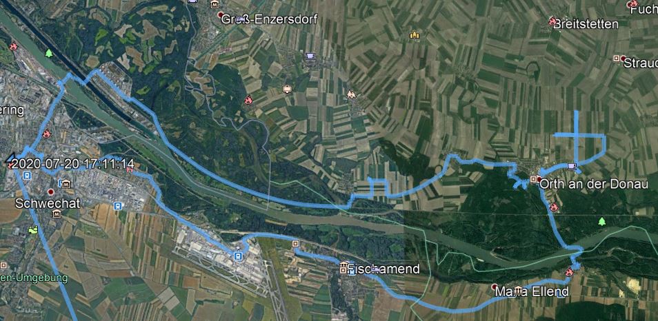 Nun geht es zurück. Ich wähle den Weg über die Radfähre nach Haslau. Am Weg dorthin mache ich noch einen Sidestep zu Schneegeist und Sandgeist #2 – GC8M76A von *TriBeCa*. Die Fahrt auf der B3 ins Ortsgebiet war nur kurz, denn längere Zeit wäre der rasende Autoverkehr an mir vorbei unangenehm.