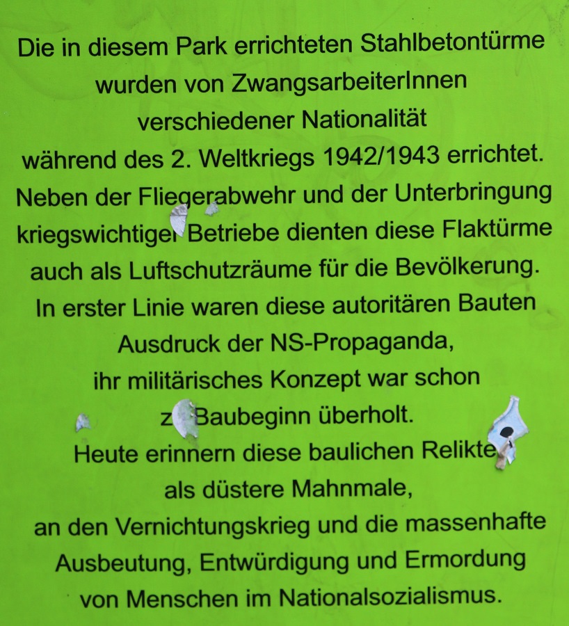 Für die 1942-1944 nach Plänen von Friedrich Tamms erbauten Flaktürme wurden vor allem Fremd- und Zwangsarbeiter, ebenso Kriegsgefangene herangezogen, die in eigens errichteten Arbeiterlagern zusammengezogen wurden. Zahlreiche österreichische Bauunternehmen waren Nutznießer dieses Unrechts, an das bis