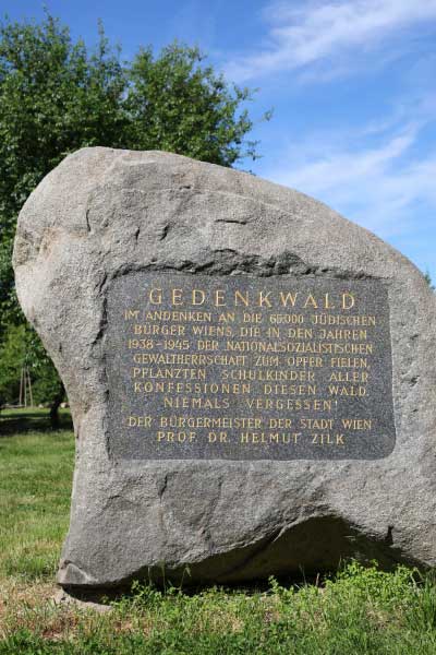 Seit 1987 erinnern der Gedenkwald und ein Gedenkstein an die über 65.000 österreichischen Jüdinnen und Juden, die dem Nationalsozialismus zum Opfer fielen. Er soll als sichtbares Zeichen gegen das Vergessen und gegen die Gräueltaten des Faschismus wirken.