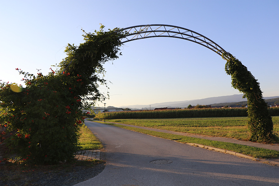 Beim Heurigenstadl, wo wir unser Quartier aufgeschlagen haben, können wir uns E-Bikes ausleihen. Mit denen machen wir noch eine Abendrunde. Unser erster Cache heuer auf einer Womotour heisst Hochsitz – GC8TAZH von AnnaPhillip. Im Bermudadreieck und das ist echt spannend gibt es auch ein Tor zum Paradies. Greenhorn400 und LadySunshine13 haben hier GC6H7RA anläßlich einer Hochzeit platziert.
