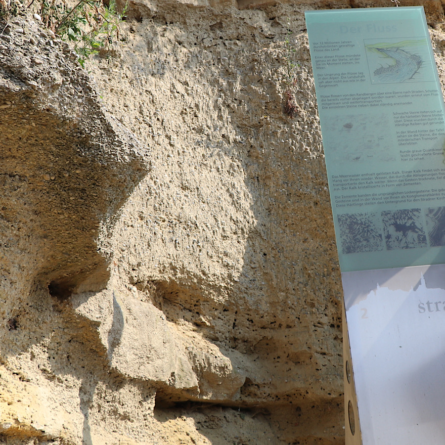 Hier ist ein denkwürdiger Ort. Genau an dieser Stelle mündete einer der großen Flüsse in ein Meer. Hier war vor vielen Millionen Jahren ein Meer, das sich über die gesamt Oststeiermark erstreckt hat. Ein Binnenmeer, das es von den großen Meeren Abgeschnitten war. Als das Gestein in den Flussmündungen an den Meeresufern trocknete kristallisierte der Meereskalk in Form von Zementen, die das ursprüngliche Lockergestein bindeten. Der heutige Untergrund des Stadener Kirchberges. Die Infos stammen aus dem Listing von GC8YWWJ von WollhexeS11.