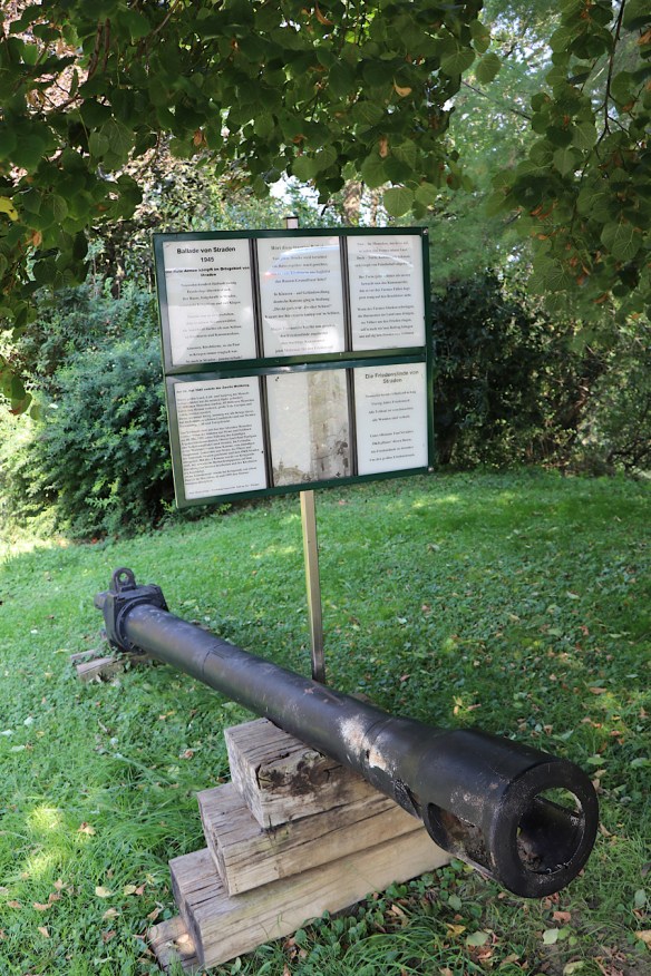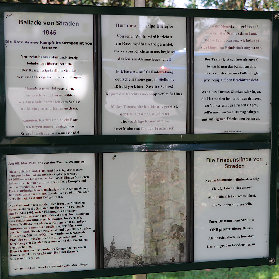 Gegen Ende des Zweiten Weltkriegs war Straden Frontgebiet. Durch deutschen Artilleriebeschuss wurde 1945 der Kirchturm der Pfarrkirche, aber auch die Gemeinde selbst schwer beschädigt. Daran erinnert das Kanonenrohr eines deutschen Geschützes, das ein wenig abseits am Rand des Hauptplatzes von Straden aufgestellt ist.