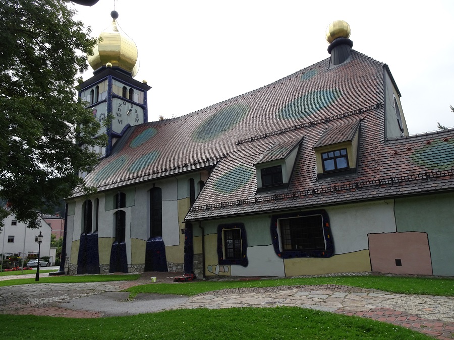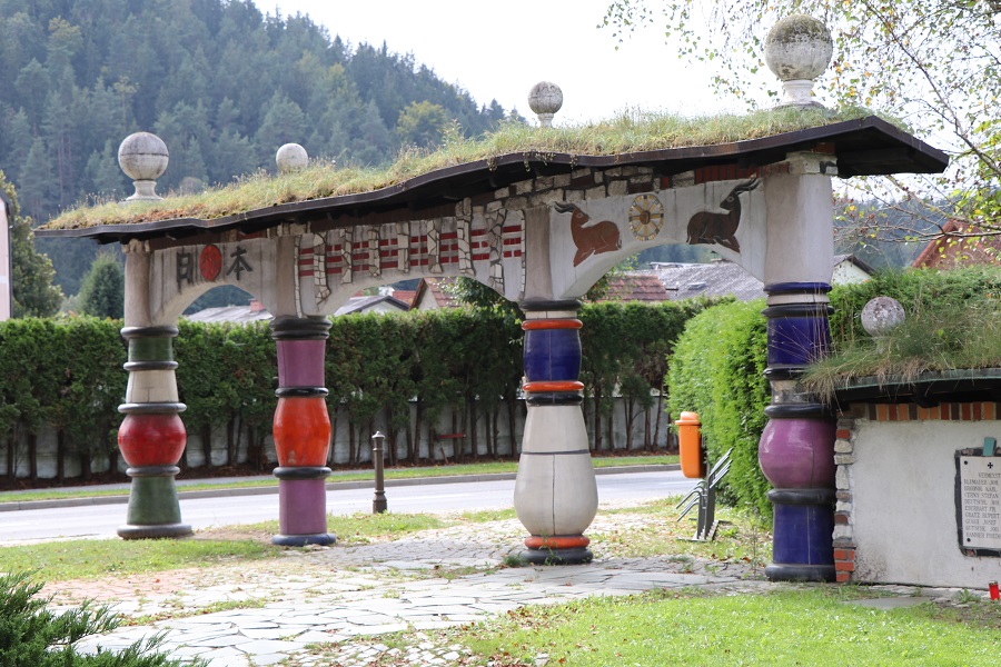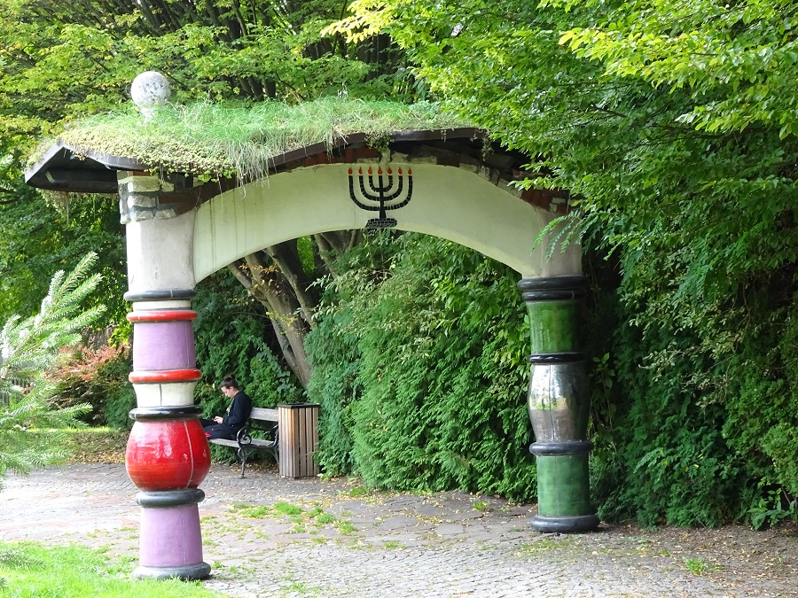 Als Außenanlagen fungieren unregelmäßig befestigte Gehflächen mit zwölf künstlerisch gestalteten Torbögen, welche die großen Weltreligionen und Kulturen sowie Ökumene, Toleranz und Gemeinsamkeit symbolisieren. Jschipf hat hier einen Virtual Cache – GC7B93R – Hunderwasserhaus angelegt.