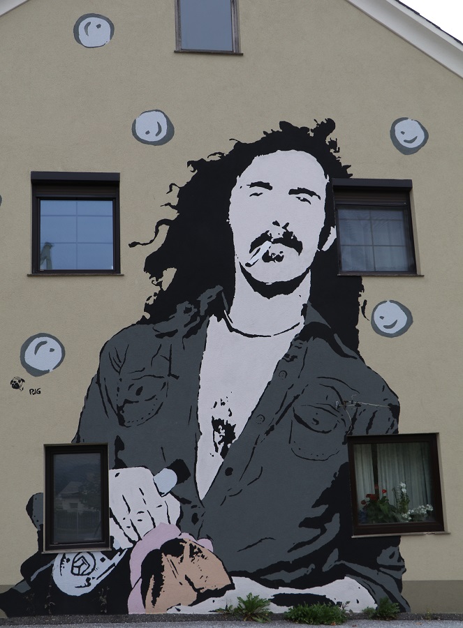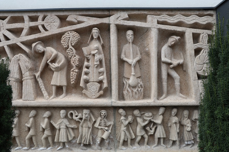 Für eine Fassade in Bärnbach schuf der Bildhauer Alfred Schlosser ein bemerkenswertes, einerseits auf die Geschichte von Bärnbach eingehendes und andererseits einen „Totentanz“ darstellendes Relief aus Sandstein.