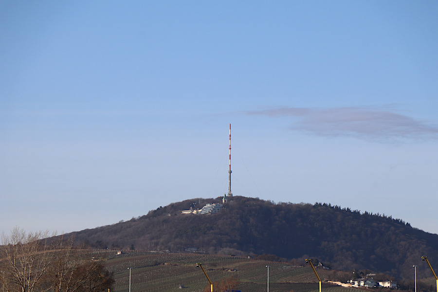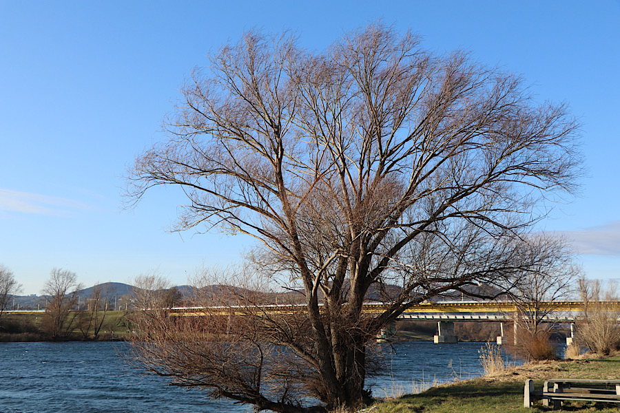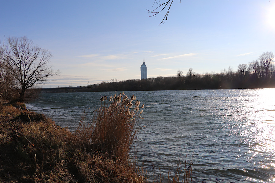 Hier sehen wir einen Eisheiligen der Neuzeit. Der starke, eisige Wind wühlt heute Donau auf, sorgt aber gleichzeitig für gute Weitsicht. Am Steinitzsteg, der von Radfahrer*innen und Fußgänger*innen benützt wird, haben wir einen schönen Ausblick auf den Kahlenberg.