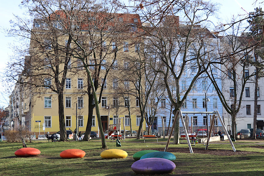 Wir starten im Kreisky-Park in Margareten. Heute gibt es einen Temperaturschub nach oben. Toller Sonnenschein, Winterjacken geöffnet, wohltuende Sonnenstrahlen so stapfen wir los.