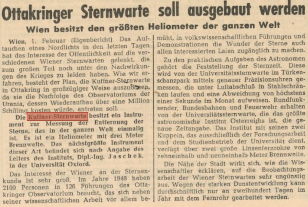 Die Kuffner-Sternwarte ist eine Volkssternwarte auf einer Anhöhe in Wien-Ottakring. Gegründet wurde sie 1884 als gut ausgerüstete Privatsternwarte mit angeschlossenem Forschungsinstitut. Seit 1982 wird sie von einem Verein geführt und bietet neben astronomischer Weiterbildung und wöchentlichen Sternführungen auch kulturelle Programme. Unter den vier Hauptteleskopen sticht der Heliometer hervor, das bis heute weltweit das größte Instrument seiner Art.