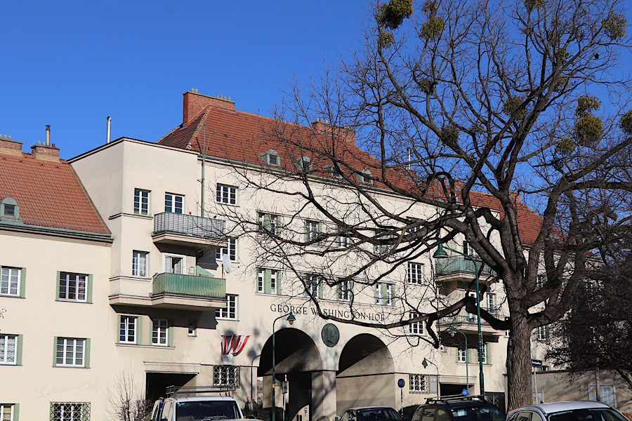 Die in der Ersten Republik (1918–1934) im sogenannten Roten Wien regierende Sozialdemokratische Partei Österreichs begann ein Projekt zur Verbesserung der Lebensumstände für Arbeiter*innen. Eine große Zahl von Gemeindebauten, meist große Wohnanlagen, wurden in dieser Zeit gebaut. Das Hauptziel war das Errichten von Wohnanlagen, die gesunde Lebensbedingungen für ihre Bewohner ermöglichten. Einschließlich der nach 1934 fertiggestellten Objekte entstanden so 65.000 Wohnungen mit Wohnraum für ungefähr 220.000 Bewohner*innen. Die Wohnungen wurden nach einem Punktesystem vergeben, das Familien und einkommensschwache Bürger*innen bevorzugte. Die Gemeindebauanlagen verfüg(t)en oft auch über Einrichtungen wie Städtische Bücherei, Kindertagesheim, Wäscherei, Theatersaal oder Kinderfreibad. Heute wohnen ungefähr 600.000 Bewohner*innen ungefähr ein Drittel der Einwohner Wiens, in Gemeindebauten, die nicht mehr alle den Charakter von Sozialwohnungen haben. (Auszug aus dem Listing von luchsp – GC11KRJ – George-Washington-Hof).