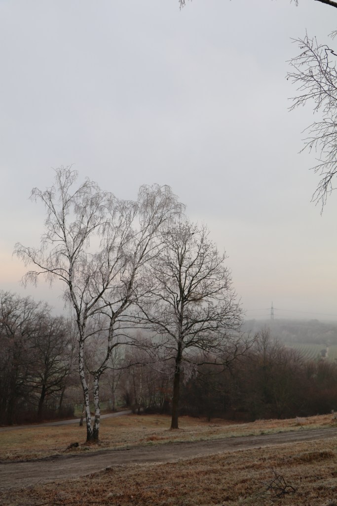 Traditionell findet zum Jahreswechsel die Vierschanzentournee statt. Eine gute Gelegenheit sich mit Freund*innen für eine Wanderung auf den Bisamberg zu treffen, und den Geocachingtrail mit Mysteries zur Vierschanzentournee zu erforschen. Als Alfack, Alveradis66, Donna Makrella und Schönhaar starteten wir beim Parkplatz bei der Genußhütte (48°18′40.6″N 16°24′02.36″E) auf schmalen Wegen zum Bisamberger Wald vorbei an den winterlichen Weingärten. Während der Morgenstunden hat sich Reif wie ein weißer Mantel über die Landschaft gelegt.