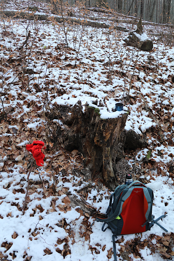 Unser Jausentisch – wir stärkten uns mit heißem Kräutertee und Bananen.