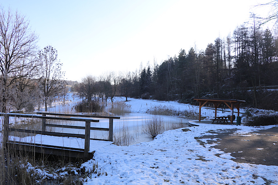 Mittags parkten wir unser Cachemobil in der Holzgasse. Vor zwei Tagen hatten wir die ersten Geocaches der G-Runde gefunden. Wir nutzten den tollen Sonnenschein für eine neuerliche Runde. Die Temperaturen bewegten sich um die Null-Grad-Grenze, deshalb waren die Wiesen immer noch schneebedeckt.