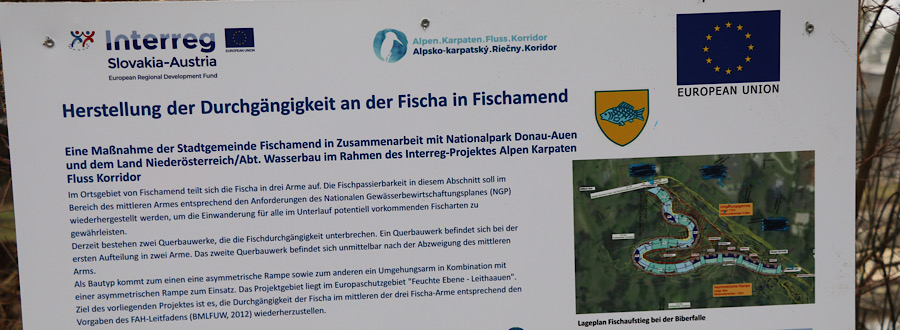 Die rasch fließende Fischa bot in Fischamend ideale Voraussetzungen für den Betrieb von Getreidemühlen, deren erste Erwähnungen lassen sich bis ins 12. Jahrhundert zurückdatieren. Hier am „Fischaspitz“ teilt sich die Fischa in der kleinen Au erstmalig, im späteren Verlauf in einem verwirrenden System aus Fallen und Schleusen in bis zu vier Wasserläufe. Im 19. Jahrhundert gab es sieben Mühlen an der Fischa. 1949 stellte die Getreidemühle des Josef Nikolowsky in Dorf Fischamend als letzte den Betrieb ein. Nach einer kleinen Yogaübung hielten wir die Dose – Der Fischaspitz – GC8ZV15 von olgueni in den Händen.