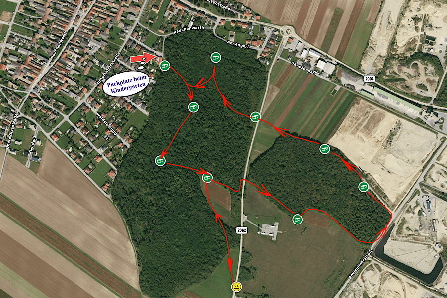 Die Fläche der Gemeinde Rauchenwarth umfasst 13,41 Quadratkilometer, rund drei Prozent der Fläche ist bewaldet. Diese bewaldete Fläche ist unser Ziel heute.