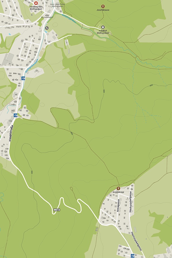 Der kleine Semmering verbindet Wolfsgraben mit Breitenfurt und früher (vor der Serpentinenstraße) war der Weg, damals wohl auch eine Strasse übers Annenkreuz die einzige direkte Verbindung zwischen den Orten. Der kleine Semmering ist bei Radlern und Motorradfahrern recht beliebt und bekannt – immerhin geht es doch von Wolfsgraben auf 319 Höhenmetern über mehrere Serpentinen auf 456 Höhenmeter, wohl eine Hommage an den echten Semmering. Auch die Polizei macht es sich an warmen Tagen ganz gerne an der Ortsausfahrt bequem um die vom Semmering herabkommenden zu empfangen. Kirchenrunde 3,5 – GC8RJN3.