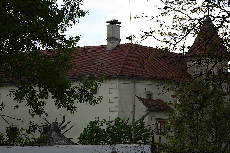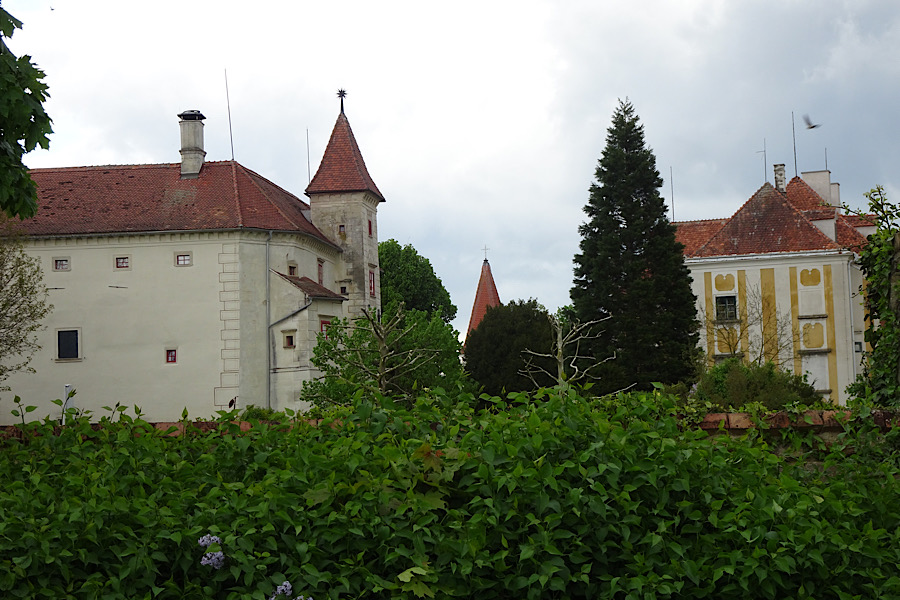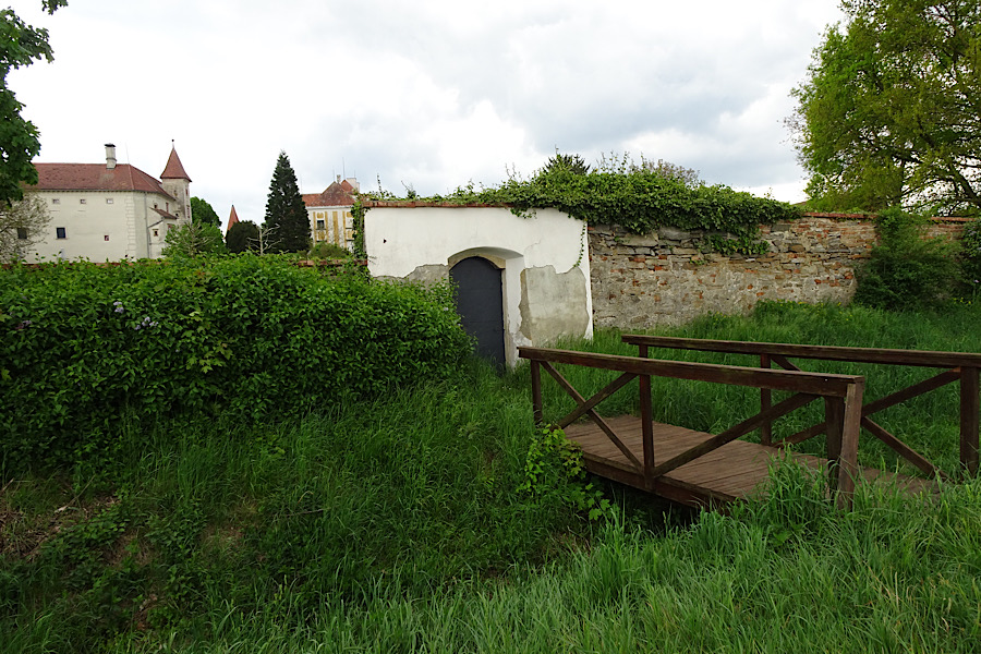 Das Dach des vorspringenden Torturmes wird von einem Morgenstern, der Nachbildung einer mittelalterlichen Waffe, bekrönt. Das prächtige Portal mit den Kettenrollen für die ehemalige Zugbrücke und der elegante Sgraffitoschmuck beeindrucken den Beschauer. Das Portal ist geschmückt mit Schnecken, Wappen, Porträtköpfen und floralen Elementen. Die Inschrift lautet: „Erasm. von Schneckenreith, Margaretha Dierbahin sein eheliche Gemahel haben das Thor erpaut sampt der Maur mit der Gnaden Gottes, dem sey Lob und Preis gesagt 1541“. Mit der Mauer ist eine Wehrmauer gemeint, deren Rest heute noch den Garten des Neuen Schlosses gegen das Dorf abschließt.