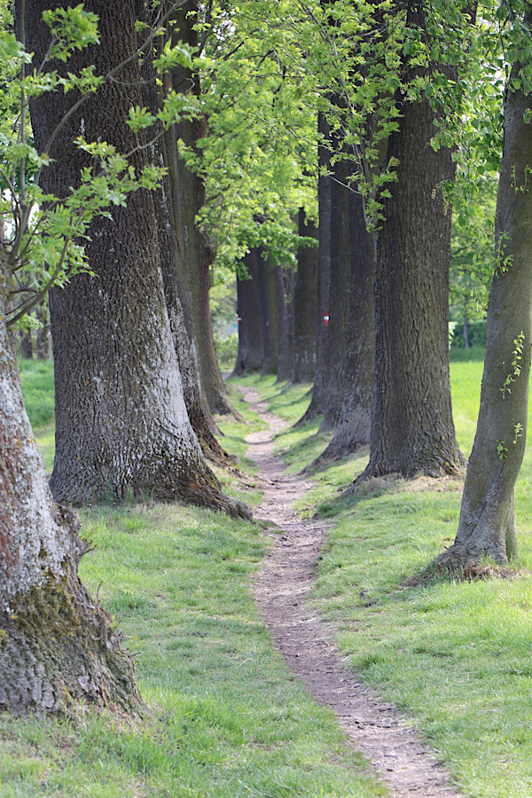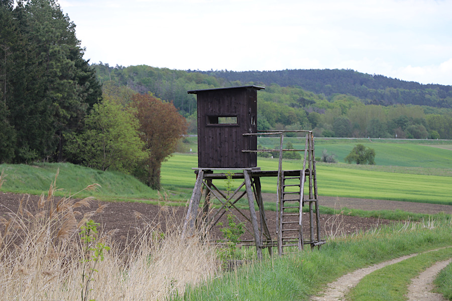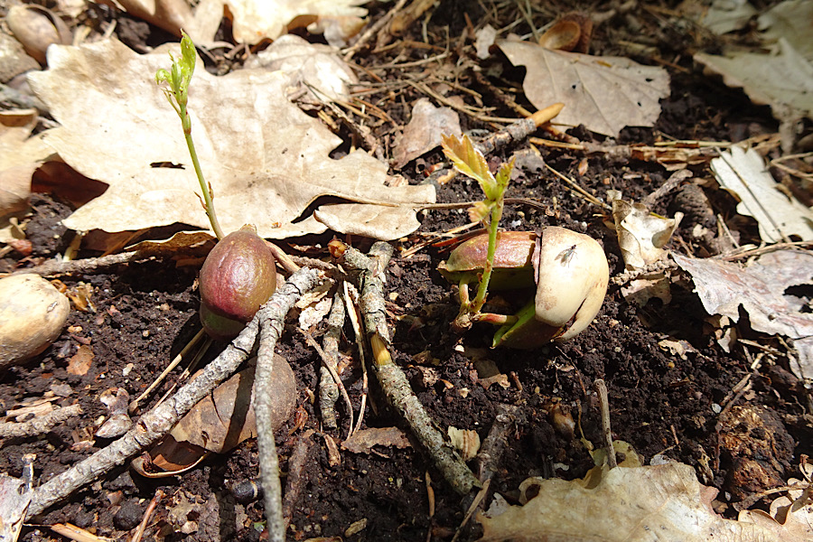 Wir folgten der Doberndorfer Strasse nordöstlich, bergauf in ein kleines Waldgebiet. Neben uns sahen wir zahlreiche Austriebe aus den Eicheln des Vorjahrs. Hier heben bei HORN IST VORN – Gnadenstuhl – GC5GKCJ von berecont. Im Listing wird auf einen ehemaligen jüdischen Friedhof verwiesen.