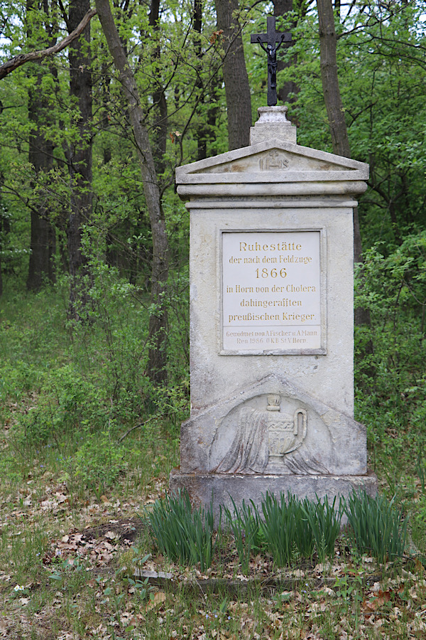 Der Gedenkstein von 1866 erinnert daran, dass beim Durchzug der preußischen Elbearmee durch Horn (in der Stadt waren 5000 Mann einquartiert) mindestens 122 Soldaten (andere Quellen berichten von bis zu 200 Toten) an der Cholera gestorben sind und davon 24 hier im Wald begraben wurden.