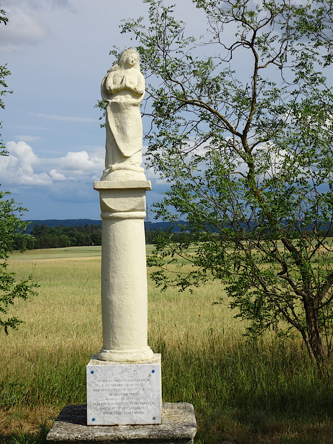 Auf quadratischem Sockel steht eine runde toskanische Säule mit Würfelkapitell. Darauf befindet sich eine moderne kirchliche Statue. Diese sakralen Kleinkunstdenkmäler sind bei uns weit verbreitet. Hier finden wir den Geocache von Gügi – Mariensäule – GC8DTE9.