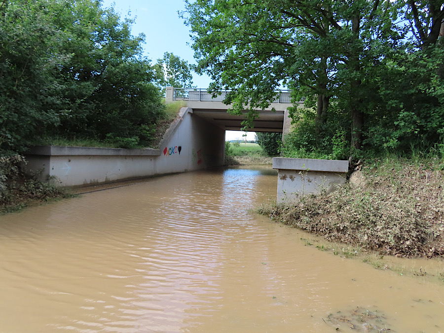 Nach der Überquerung des HORN iST VORN – Breiteneicher Bach – GC8K654 von bereciont bot sich uns ein Bild von Überschwemmungen und Hagelschäden. Dann wagten wir den Lauschangriff #220 ÖBB-Fernsprechbude (Horn-Breite – GC8KY8B von DaPepi. In der Nähe des „Hörrohrs“ wurden wir fündig.