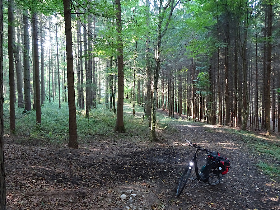 Nach dem sonntäglichen Frühstück im Freien bei tollen Sonnenschein sattelten wir unsere E-Bikes für die nächste Rad-Geocaching-Tour ins benachbarte Burgenland. Ziel war heute der Kirchenwald westlich von Neusiedl bei Güssing (ungarisch: Felsőújlak) in der Gemeinde Kukmirn. Der kleine Wald wird im Norden vom Rettenbach und im Süden vom Heutalbach begrenzt.