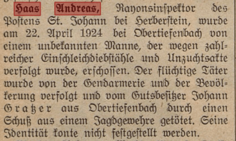 Den nebenstehenden Zeitungsaus-schnitt gibt es Österreichischen Nationalbibliothek – Digitales Archiv, Zeitschrift Öffentliche Sicherheit, 1926, Heftnummer 9-10, Seite 46.