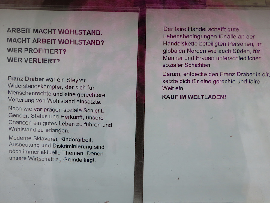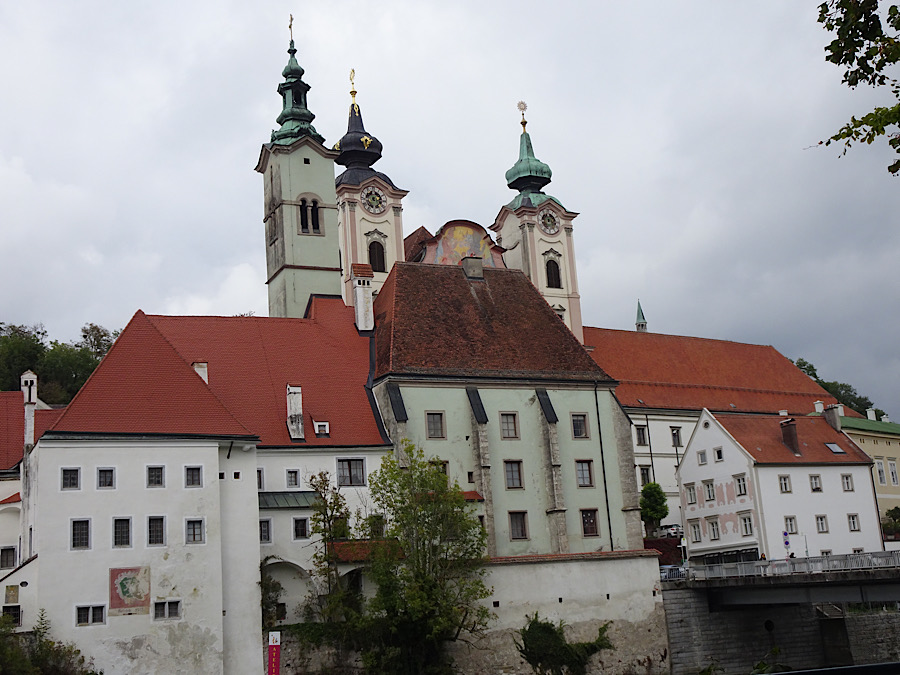 Nicht nur wir sind an diesem trüben Oktobertag in Steyr unterwegs, mehrere Stadtbesichtigungstrupps kreuzen unsere Wege. Mehrere Pensionist*innentrupps und eine Bundesheergruppe besichtigen die drittgrösste Stadt Oberösterreichs, wo bei der kürzlich durchgeführten Bürgermeisterwahl der Gewerkschafter Markus Vogl zum Stadtoberhaupt gewählt wurde.