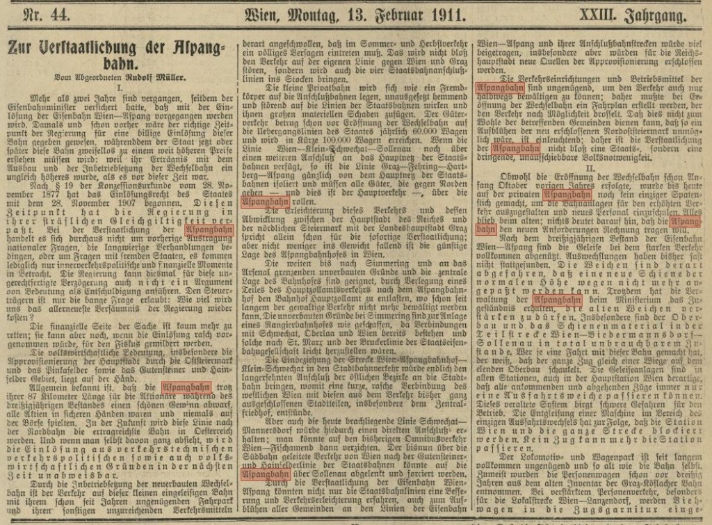 Hier noch ein Artikel aus der Arbeiterzeitun von 1911 zur Verstaatlichung der Aspangbahn
