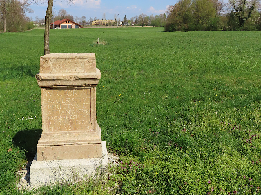 Der erhabenen Siegesgöttin haben Lucius Restitutus Perpetuus und Attiniana seine Frau für sich und alle Restitute, besonders für ihre Söhne Restitutus und Florinus diesen Votivstein gerne und mit Recht machen lassen.