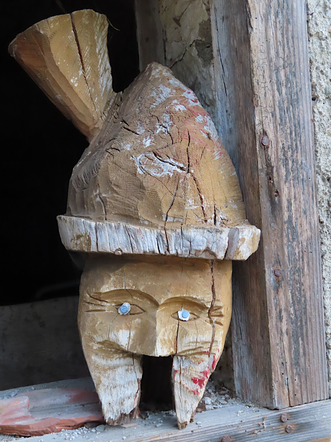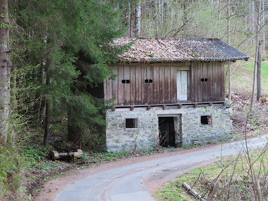 Wir wählen die Route Richtung Kapeller Michael quasi zum Ende der Strasse. Aus einem verlassenen und desolaten Stadl blickt uns ein Holzkopf an. Vor dem Stadl betreibt ein Rinnsal ein kleines Wasserrad.