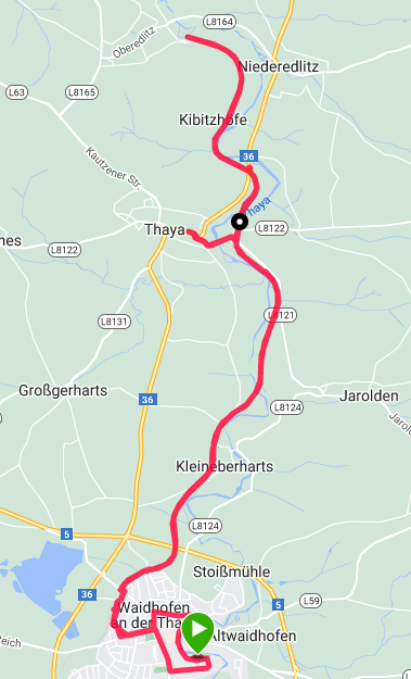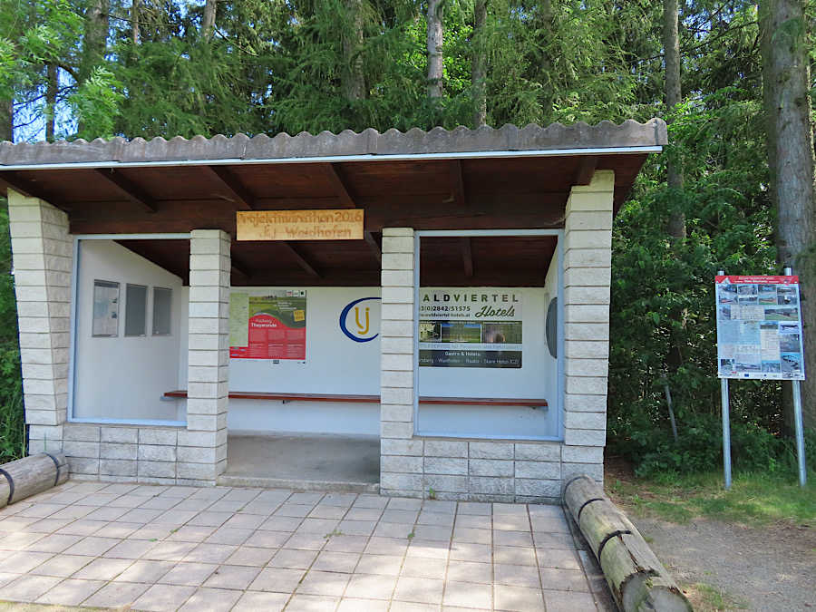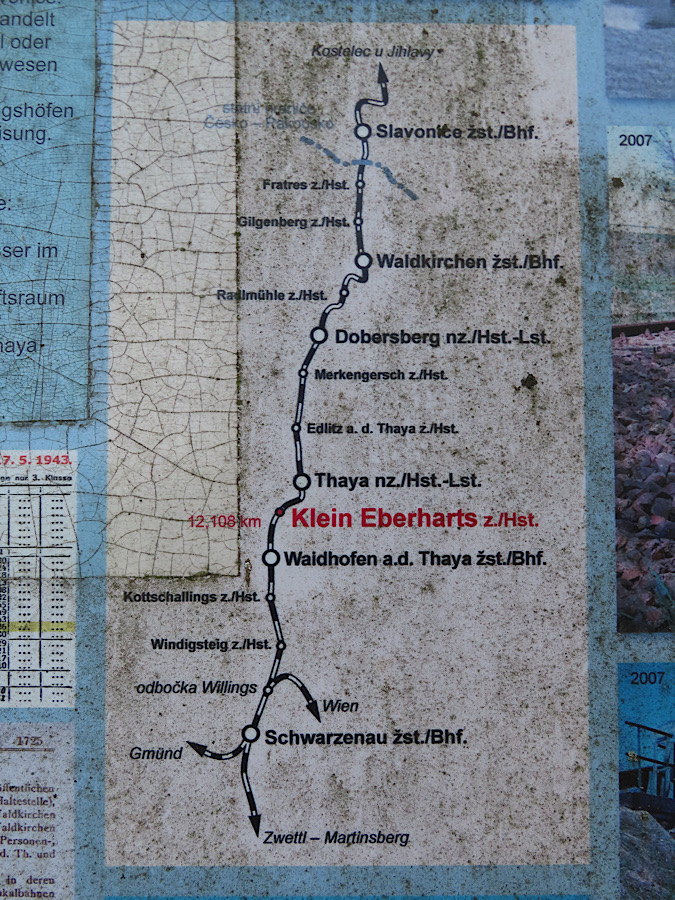 Die Strecke von Schwarzenau nach Waidhofen an der Thaya wurde am 3. August 1891 offiziell eröffnet, die Verlängerung bis nach Zlabings, von wo aus die weite Welt Böhmens erreichbar war, startete am 20. Juni 1903. Aus mangelnder Weitsicht und verkehrspolitischer Dummheit (aus heutiger Sicht auch aus Klimagründen) wurde der Bahnbetrieb etappenweise eingestellt. Trotz der tschechischen und österreichischen Bahninteressen und dreimaliger höchster Priorität in niederösterreichischen Verkehrskonzepten kam es nach der Übernahme der Gesamtstrecke durch das Land Niederösterreich zur Einstellung des gesamten Bahnverkehrs und statt dessen wurde eine Autobuslinie geführt. Alle Ideen waren Schnee von gestern. Eine umfangreiche Darstellung Geschicht dieser Bahnlinie findet man im Listing der Geocaches vom TeamThayatal entlang des Radweges.
