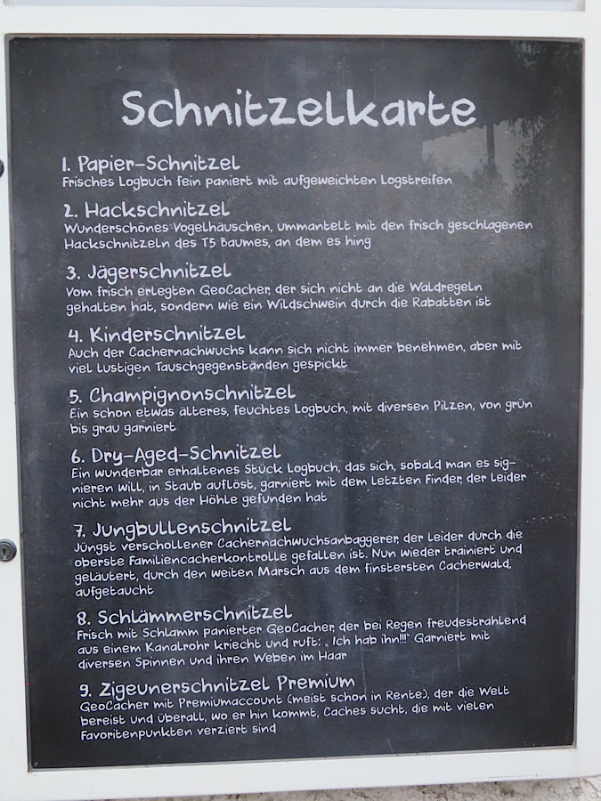 Natürlich besuchten wir auch den Bonuscache versteckt von “ Der alte Wirt“ – GC8YYPW. Nacdem wir den Code geknackt hatten mit den verschiedenen Schnitzeln konnten wir uns ins Logbuch eintragen. Wir identifizierten jns mit dem “Zigeunerschnitzel Premium“. Eine Superidee und zurecht ausgezeichnet.