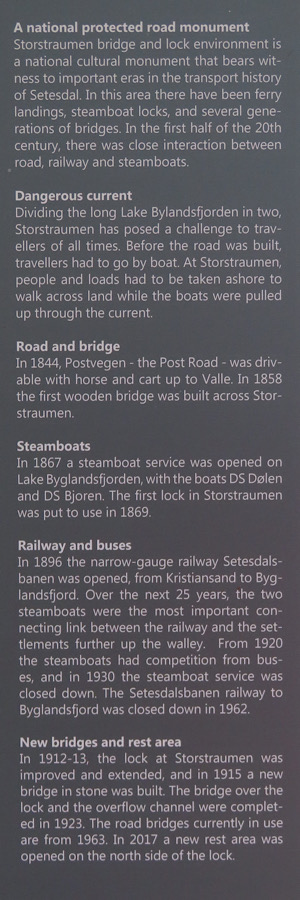Der Storestraumen ist eine natürliche Barriere zwischen dem oberen Teil ( Åraksfjorden ) und dem unteren Teil des Byglandsfjorden und eine der engsten Stellen im gesamten Flusslauf. Der Byglandsfjord hat einen niedrigeren Wasserstand als der Åraksfjord. Um den Schiffsverkehr zwischen den beiden Teilen des Fjords zu sichern, wurde 1869 eine Schleuse bei Storestraumen gebaut.