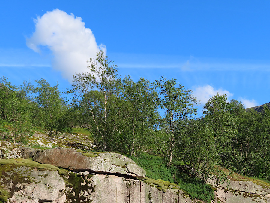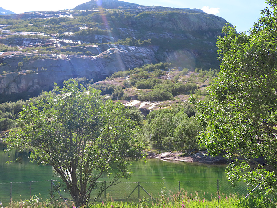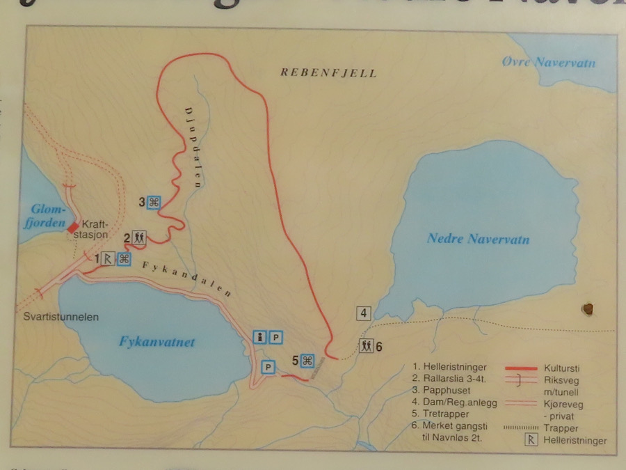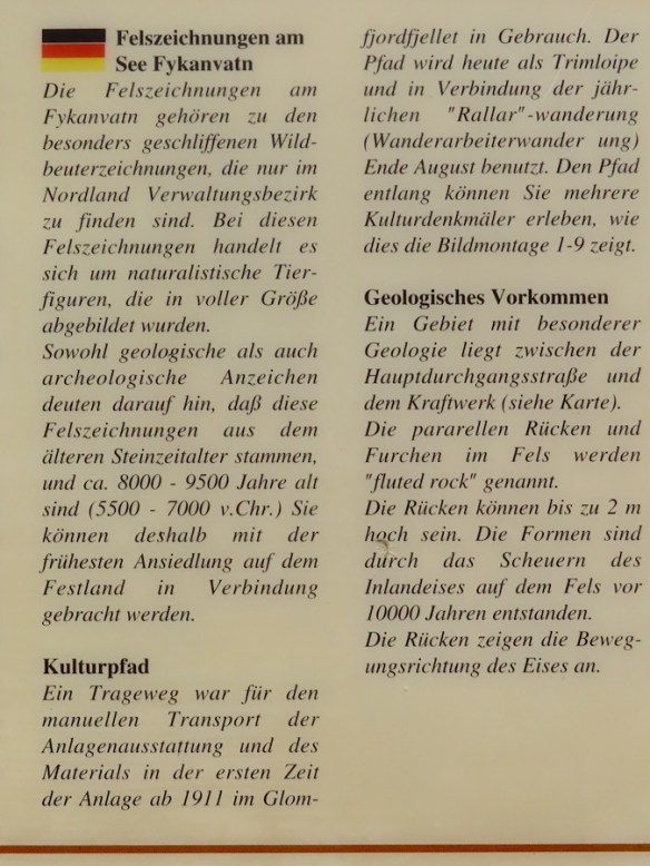 Über uns thront das Glomfjellet. Hier startet auch ein Wanderweg in das Kvitsteindalen. Einen Einblick in die Schönheit des Fjell gewährt uns der Bericht im Blog von Stefans Tour Und Top-Tourblog. Beim Heben der Geocaches von hatlestad – GC76PNJ (Fykanvatnet) und GC76PQK (Parkering Fykan) lesen wir bei den Infotafeln, dass hier Felszeichnungen gefunden wurden.