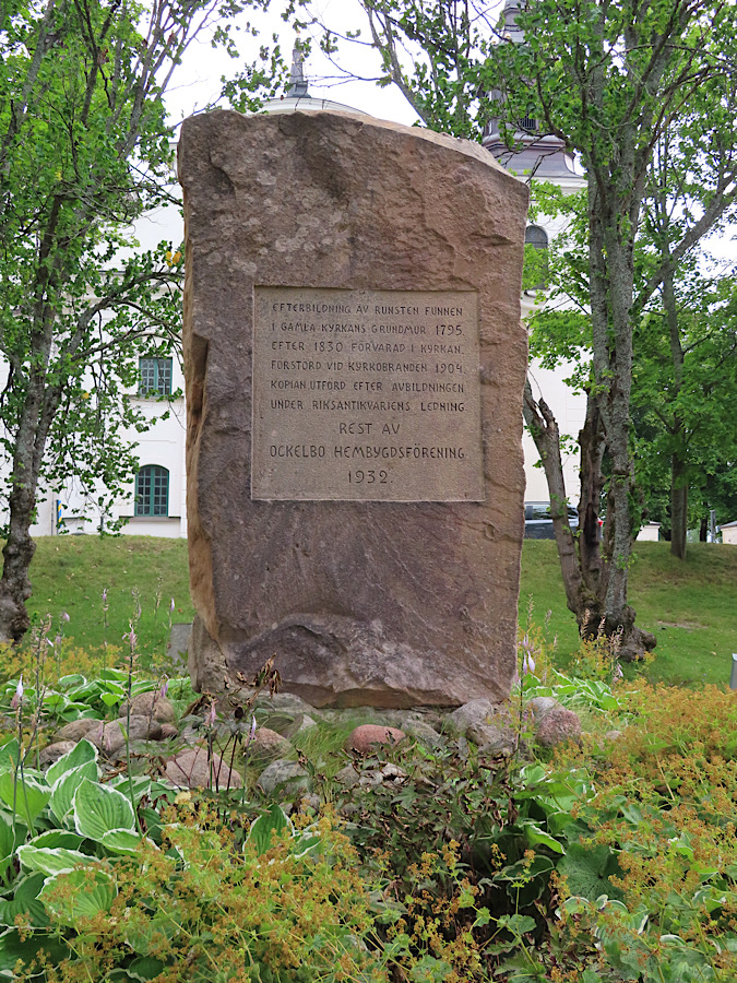 Wir umfahren den Großraum Stockholm auf unserer Tour und schwenken mit unserer Tourplanung ins Innere von Schweden. Wir machen eine Zwischenstation in Ocklebo, um uns einen Runenstein bei der Kirche anzusehen. Der Runenstein ist eine Nachbildung eines Runensteins, der 1795 in der Grundmauer der alten Kirche gefunden wurde. Er wurde in der Kirche aufbewahrt und beim Brand 1904 zerstört. Die heutige Kopie vor der Kirche wurde unter der nach einem Bild angefertigt.
