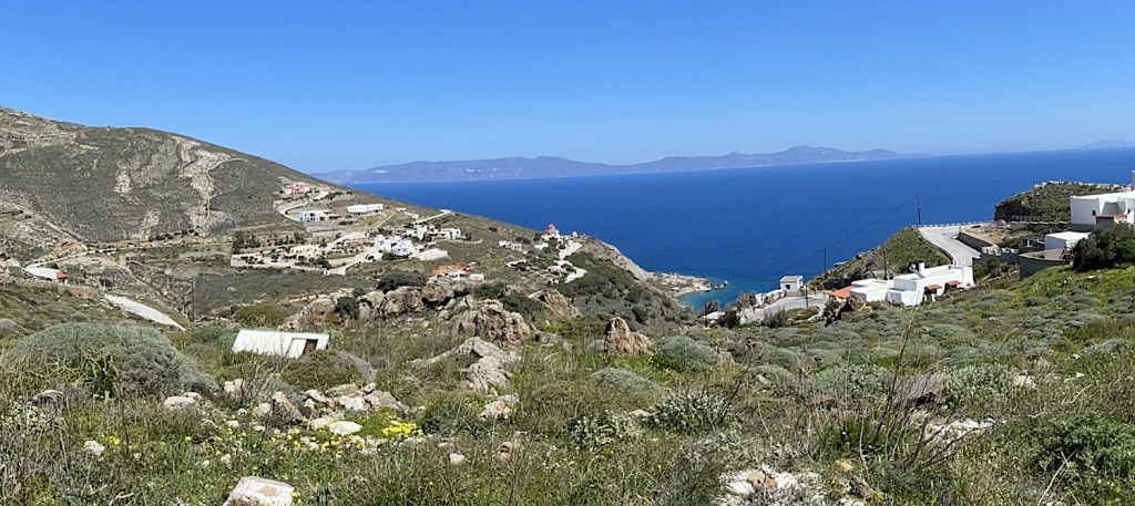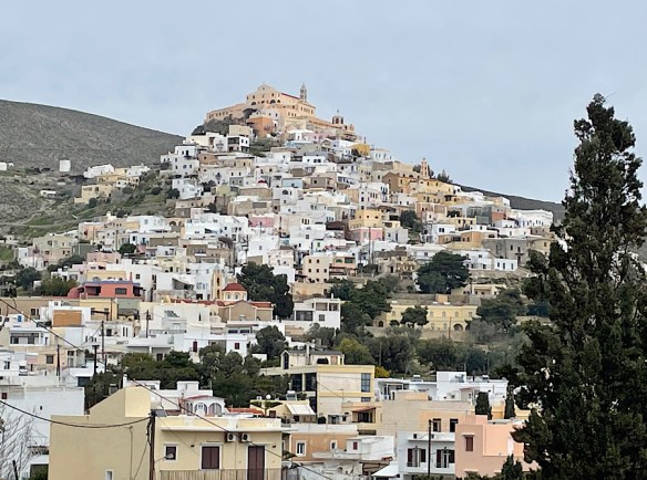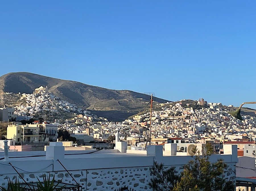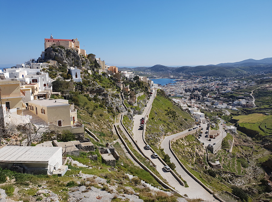 Ano Syros ist jener Stadtteil, der auf einem eigenen Hügel liegt. Ano Syros bildet die vorwiegend von Katholiken bewohnte ältere, vom Meer aus gesehen linke Hälfte, gekrönt von der Bischofs-Kathedrale St. Georg. Darunter liegen ein 1633 gegründetes Kapuziner- sowie ein Jesuitenkloster. Wir starten vom Christian‘s Haus zur Leophóros Kipríon Agnoouménon, wo wir einen herrlichen Blick auf Agios Dimitrios und die Küste haben.