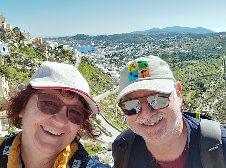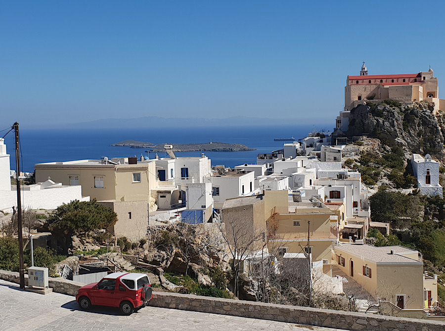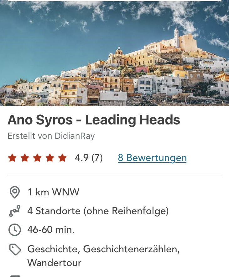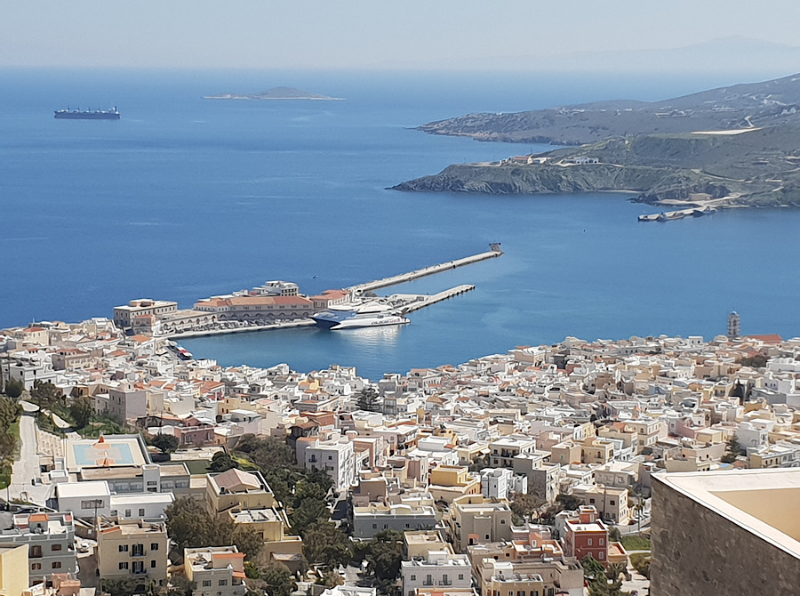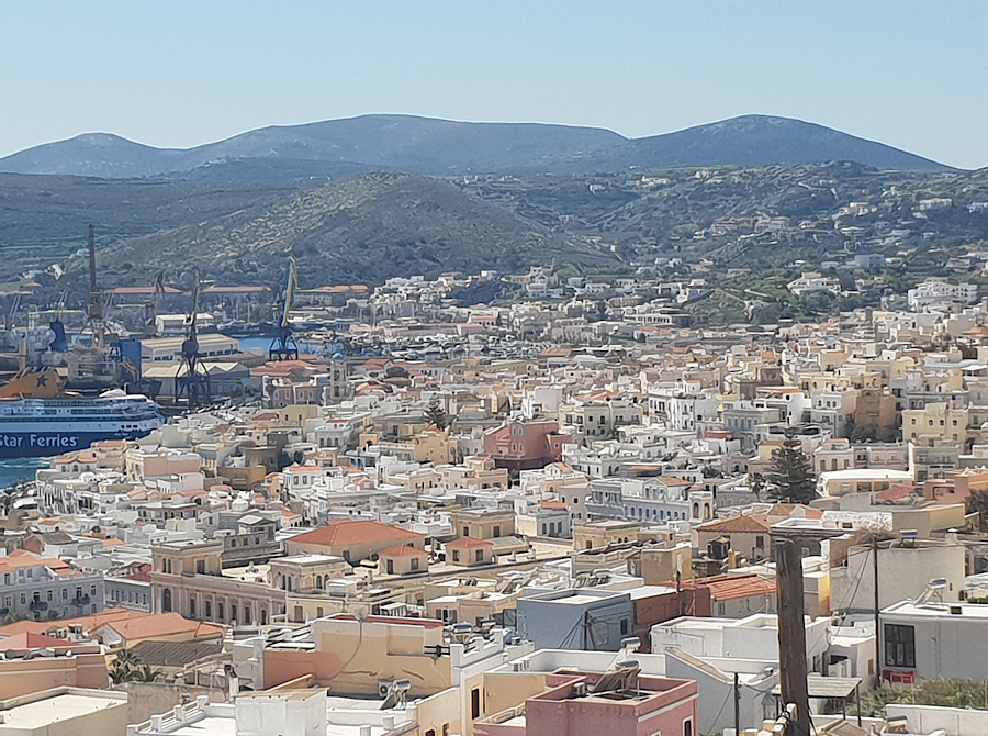 Ano Syros ist jener Stadtteil, der auf einem eigenen Hügel liegt. Ano Syros bildet die vorwiegend von Katholiken bewohnte ältere, vom Meer aus gesehen linke Hälfte, gekrönt von der Bischofs-Kathedrale St. Georg. Darunter liegen ein 1633 gegründetes Kapuziner- sowie ein Jesuitenkloster. Wir starten vom Christian‘s Haus zur Leophóros Kipríon Agnoouménon, wo wir einen herrlichen Blick auf Agios Dimitrios und die Küste haben.