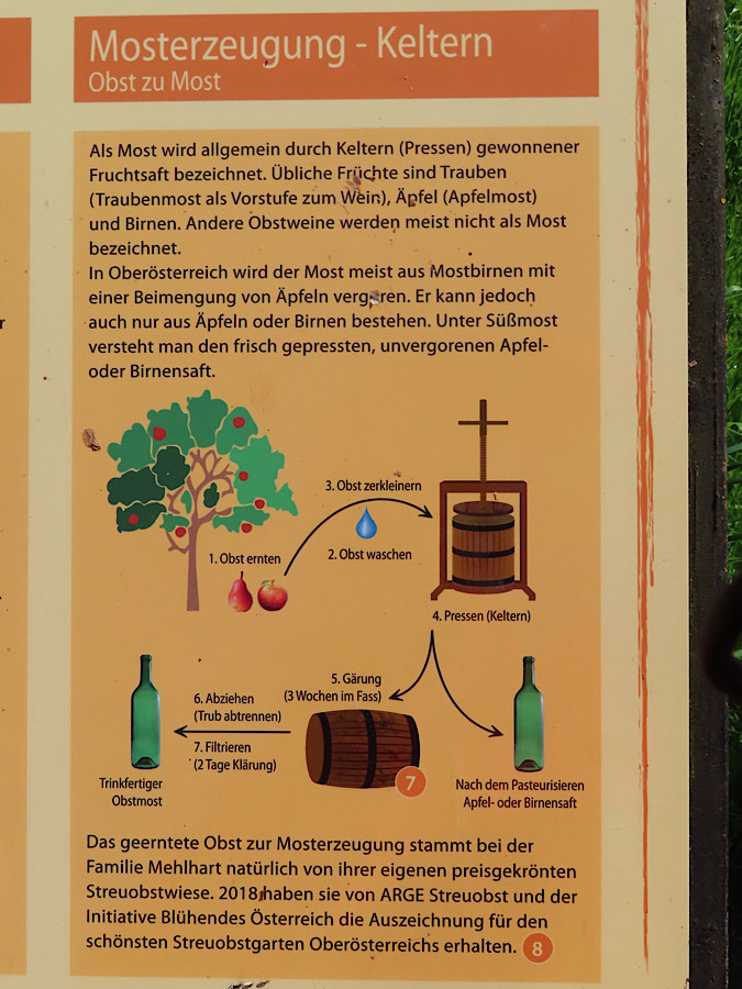 Bevor wir die Sazach erreichen machen wir Pause beim Mostbauer zˆ Stockham. Dem Motto: „Komm, sit´z di her und kost unsern Most und Saft und unsre guate Innviertler Brotzeit !“ können wir nicht widerstehen und schon wird uns ein Most gspritzt serviert. Dazu essen wir ein Erdäpfelkasbrot und Kircheln oder Omas Krapfen wie sie hier heißen.