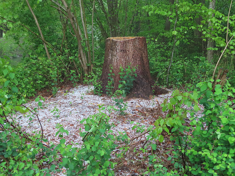 Plötzlich begann es zu schütten und zu prasseln. Ein heftiger Graupelschauer gemischt mit kleinen Hagelkörnern tobte sich aus. Wir suchten vor dem Hagel Deckung unter einer dichten Fichte. Der zusätzlich heftige Regen, schaffte riesige Regenpfützen und unser Standplatz verwandelte sich um uns in einen kleinen See. So heftig und intensiv, umso rascher war bald alles vorbei.