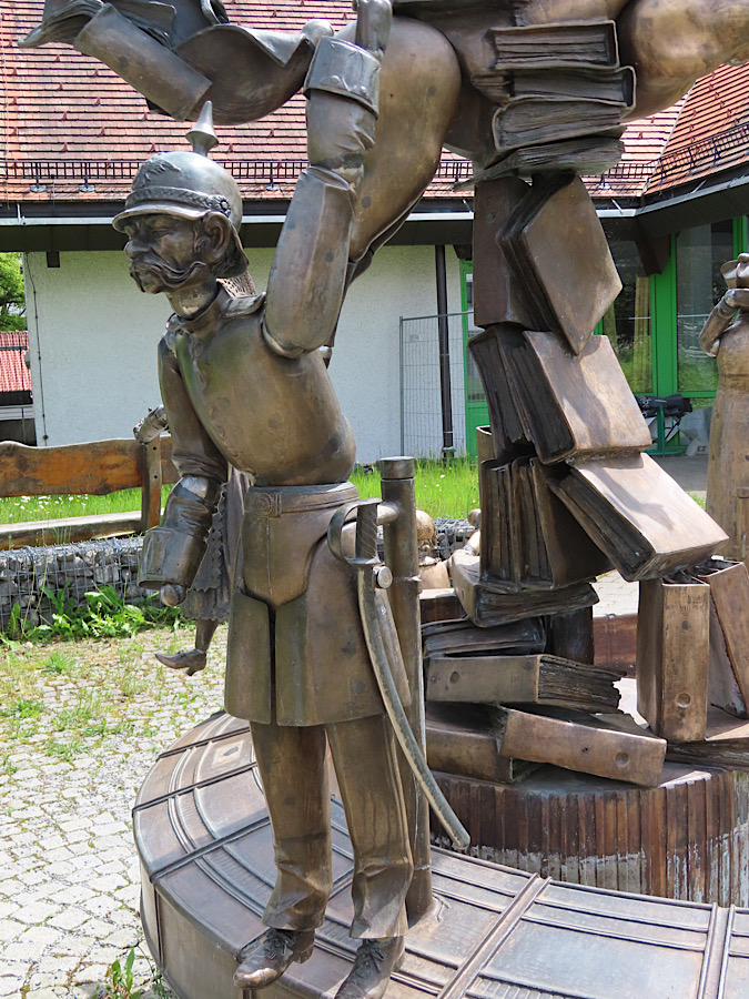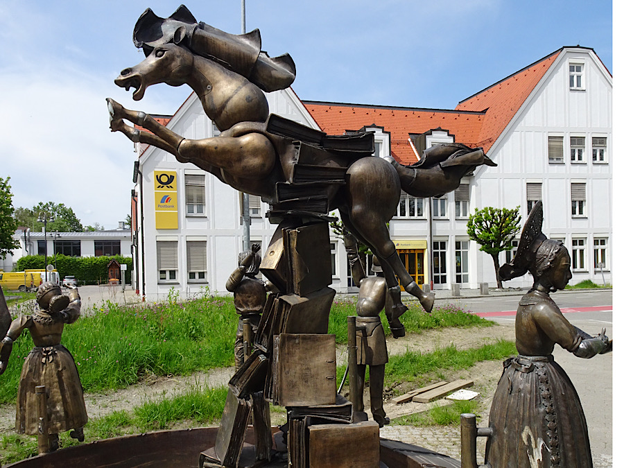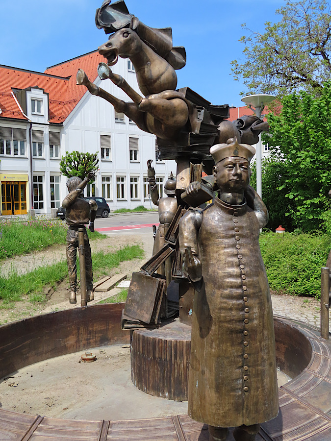 Den Spruch, wonach von 6 Allgäuern, aufeinander-„gebeigt“ der unterste so „verdruckt“ sei wie der oberste wurde bei dieser Brunnenplastik hervorragend umgesetzt. Das Denkmal wurde nur mit männlichen Figuren gestalttet, da Männer schon ein wenig mehr „verdruckt“ seien als das weibliche Geschlecht.