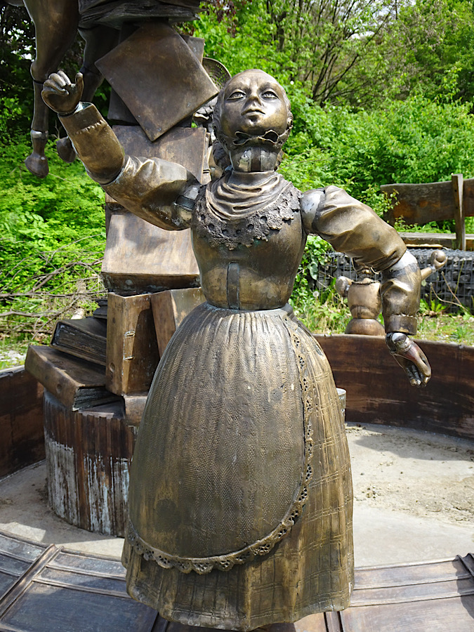 Dass auch der Klerus von „Verdrucktheit“ nicht frei ist wird durch die unterste Figur dargestellt Auf ihm lasten diverse Figuren wie der „Leisetreter“ und der „Kartenspieler“. Die Figur mit dem vorgehaltenen Spiegel spuckt zumindest während der warmen Jahreszeit Wasser auf ahnungslose Passanten. Wir hatten Glück, bei u s war die „Spuckfunktion“ noch außer Betrieb.