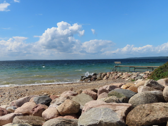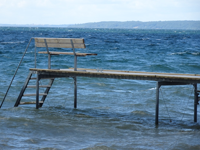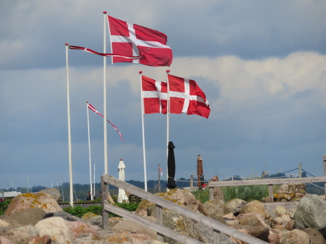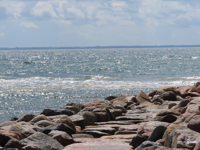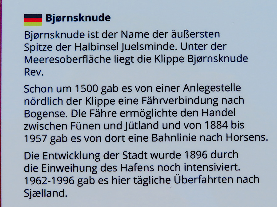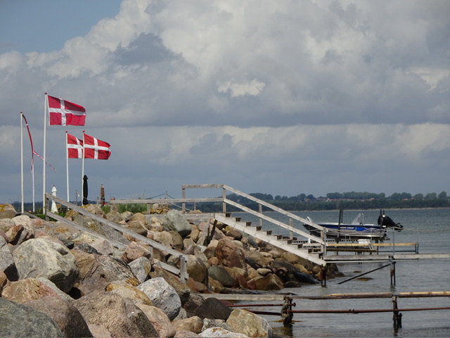 Am nächsten Tag starten wir vormittags unsere Radtour nach Juelsminde, wir werden nach 100 m gestoppt, weil am CP ein Textilflohmarkt aufgebaut wird. Da muss die Ware ja begutachtet und gustiert werden. Wir schaffen es aber doch weiter zu kommen. Die Fahrt mussten wir mehrmals unterbrechen, weil wir unter größeren, dichten Bäumen Schutz vor den durchziehenden Regenschauern suchten. Nach ca. 15 km erreichten wir Bjørnsknude.