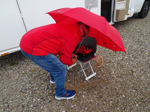 Nun gings zurück zum Womo, saftige Lammkottelets warteten auf uns. Allerdings mussten wir wegen der Witterung zu kreativen Maßnahmen greifen.
