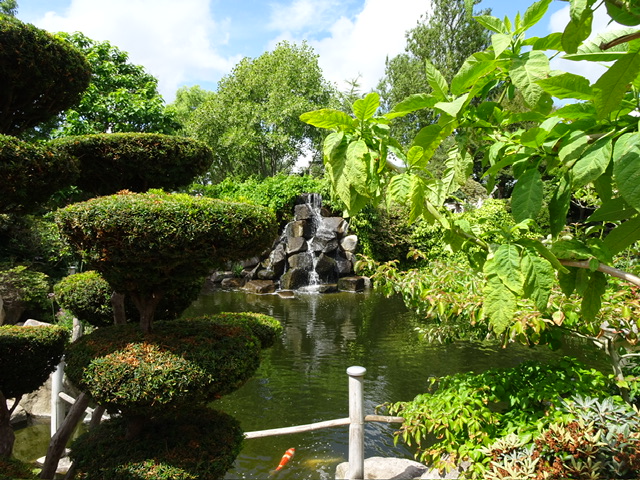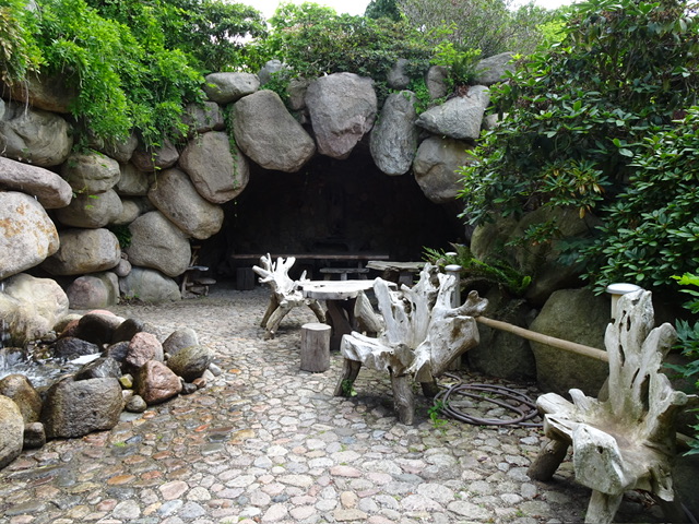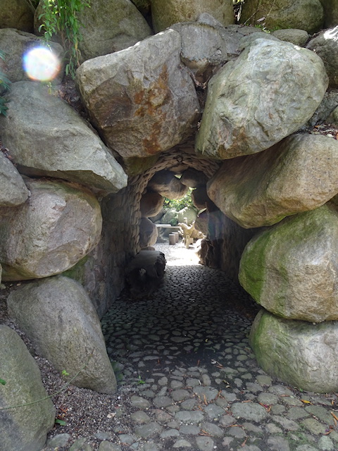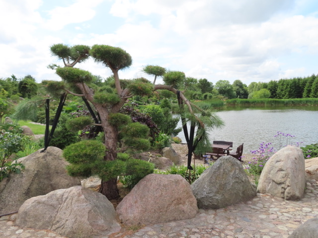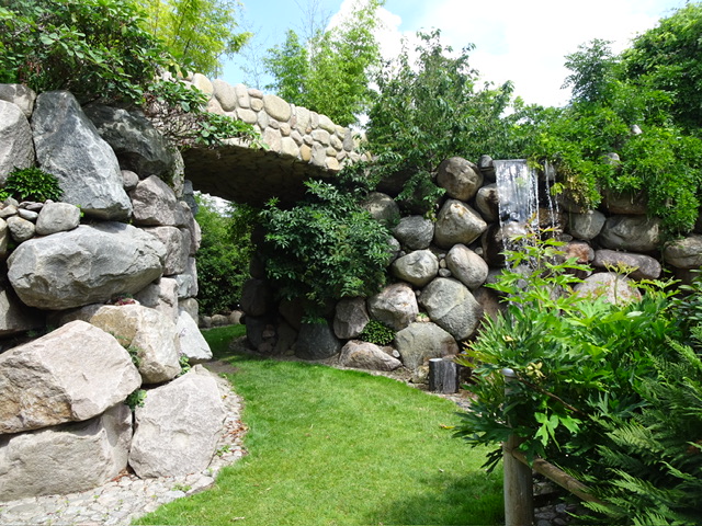 Am Eingang erwartet uns ein älterer Herr mit einem kleinen Hund an der Leine. Es dürfte der Besitzer, Planer und Gestalter dieses Garten sein. Auf jeden Fall bezahlen wir bei ihm den Eintrittspreis und bekommen zur Bestätigung je einen Stempel auf die Hand gedrückt. Wir schlendern durch den Garten und sind neugierig was uns hinter der nächsten Biegung erwartet. 1985 wurde hier mit dem Bau des Garten begonnen.