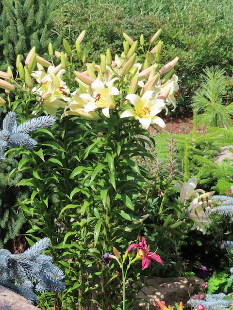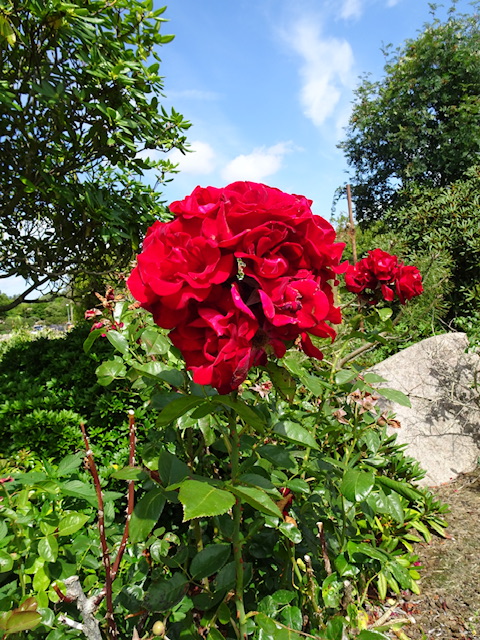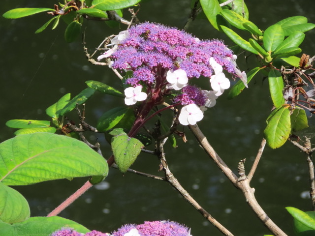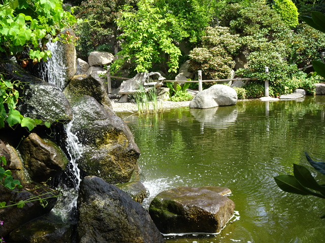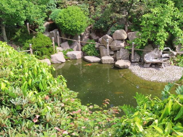Am Nachbargrundstück, die Strasse teilt den Zengarten in zwei Teile, gibt es einen Teich mit einer weiteren Gartenlandschaft. Der Duft der Blumen, die Blumen-Arrangements wirken ansteckend beruhigend und wir genießen dabei die Nachmittagssonne.