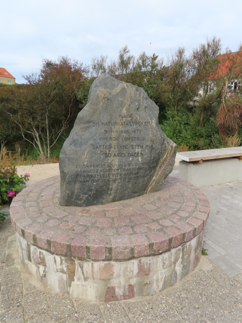Die ersten Touristen, die nach Lønstrup kamen, waren – heute würde man es so nennen – Katastrophentouristen. Schaulustige, die aufgrund eines landesweiten Spendenaufrufs nach der Naturkatastrophe, die Lønstrup am 11. August 1877 heimsuchte, in den Ort kamen und bei den Aufräumarbeiten zusahen. Ein Gedenkstein inmitten des Ortes, in der Nähe des kleinen Baches, der durch Lønstrup hindurchplätschert, erinnert an jenen Tag im August des Jahres 1877, an dem eben dieser Bach aufgrund eines verheerenden Unwetters zu einem gewaltigen Strom anschwoll. Innerhalb einer halben Stunde hatte er eine 15 Meter breite und 4,5 Meter tiefe Schlucht gebildet, vier Häuser mit sich gerissen und weitere stark beschädigt. Info stammt von der Kapidaenin.