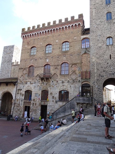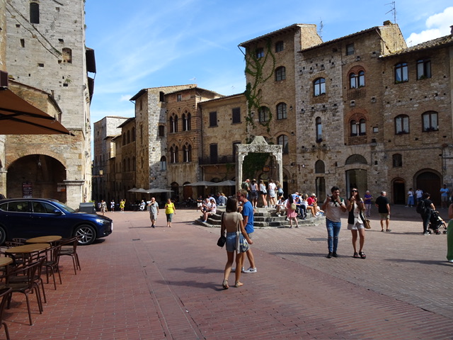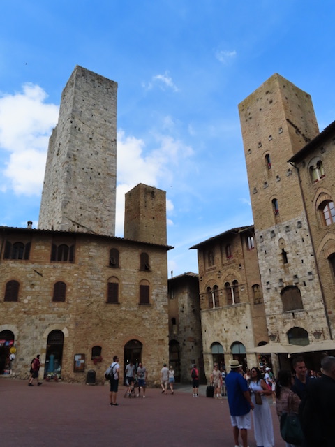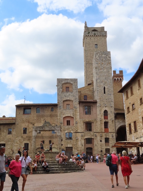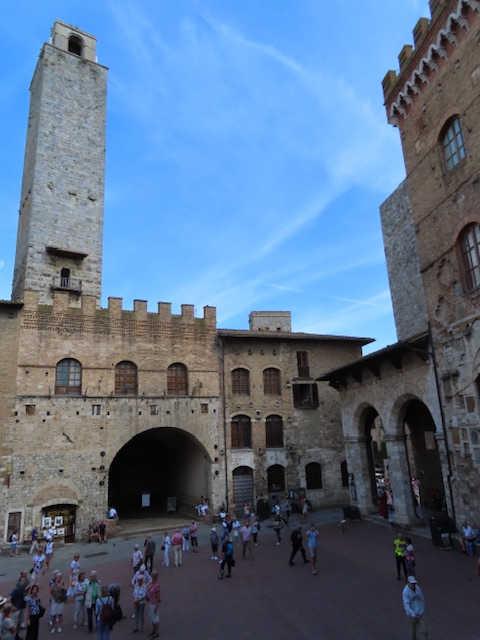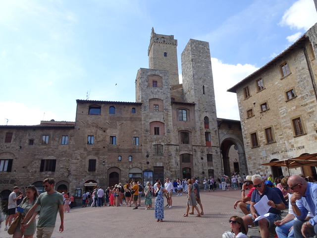 Der historische Stadtkern ist seit dem Jahr 1990 Teil des Weltkulturerbes der UNESCO. San Gimignano besitzt noch einige der mittelalterlichen Geschlechtertürme, die in anderen Städten nur als Stümpfe erhalten blieben. Im Mittelalter versuchten die Patrizierfamilien, sich in der Höhe ihres Geschlechterturmes zu übertreffen, obwohl ein luxuriöses Leben darin nicht möglich war. Von den einst 72 Geschlechtertürmen existieren in San Gimignano heute noch 15. Die beiden höchsten, der Torre Grossa aus dem Jahr 1311 und der Torre della Rognosa, weisen eine Höhe von 54 bzw. 51 Metern auf. Die Zisterne auf der Piazza della Cisterna entstand 1287 und wurde 1346 durch den Podestà Guccio Malavolti erweitert.