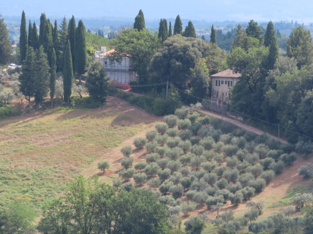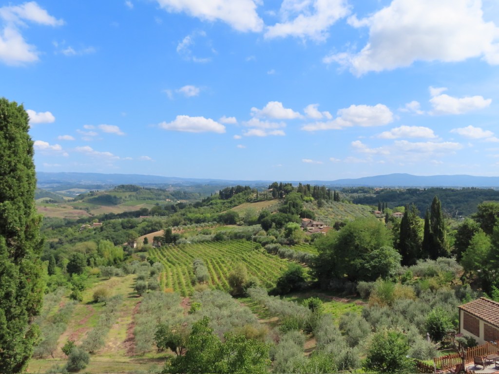 Wir parken uns auf einem Stellplatz ein und radeln ca. 2 km an den Ortsrand und parken unsere Drahteseln beim Coop ein. Direkt beim Eingang in die Stadt einen herrlichen Blick auf die Landschaft der Toskana.