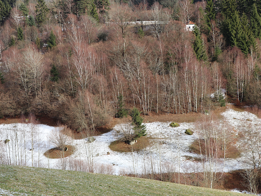 Neujahrstänze der Mühlviertler:innen rund um die Bäume schlossen wir aus, ebenso alle Annahmen mit Ausserirdischen. Welche Rolle spielen dabei die Wurzeln der Bäume? Wir beobachteten auch, dass am Waldrand ebenfalls schneefreie Flächen sind. So wirklich lösen konnten wir diese Frage nicht.