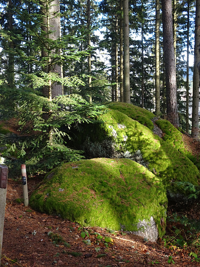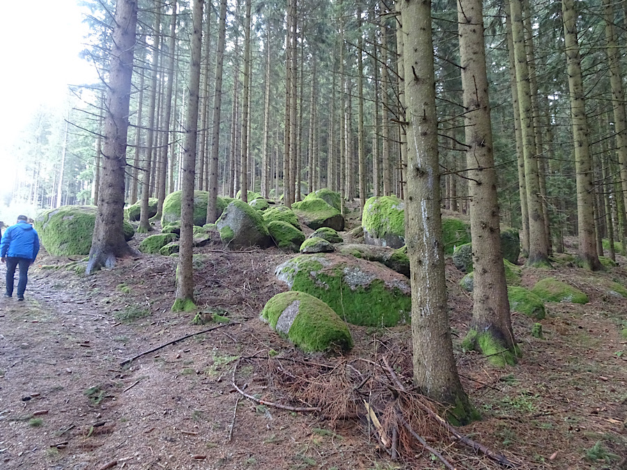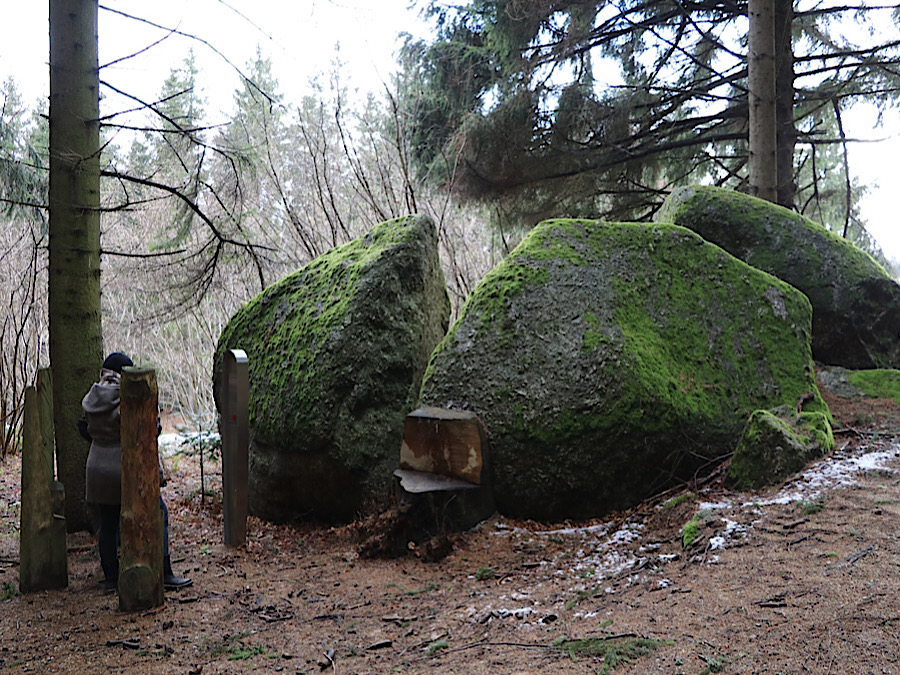 Kaum sind wir von der Aussichtsplattform runter, an den „Eiszeitfindlingen“ vorbei und spazieren aus dem Wald stehen wir vor dem nächsten Rätsel.